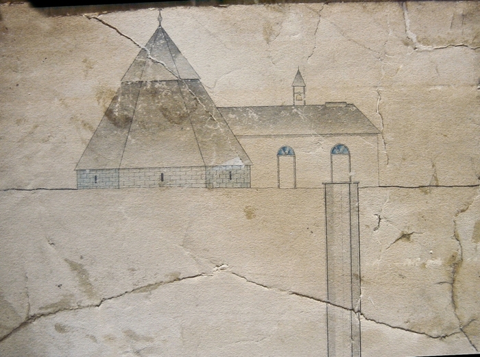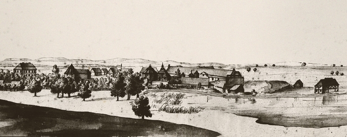 Kresba J. Venuta z roku 1796 (detail), nejstarší vyobrazení chemické továrny v Lukavici