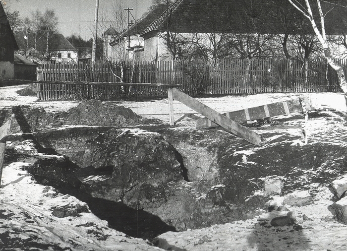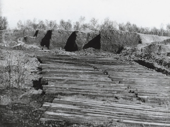 Odkryté zbytky dřevěných sloupů, na tomto místě stály v 1. polovině 19. století kyzové hutě