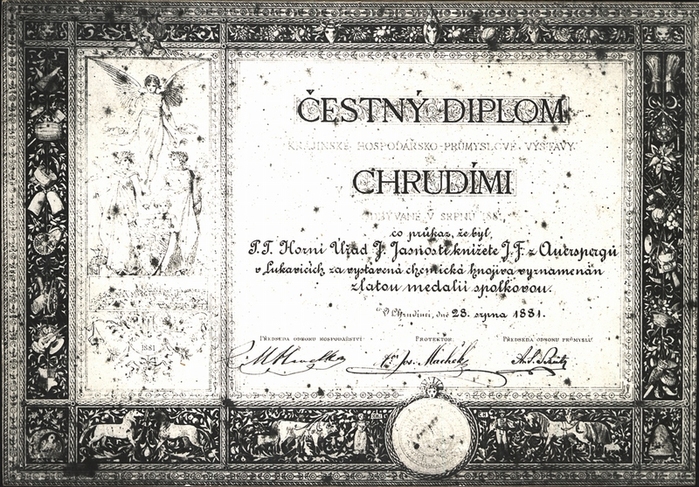 Diplom a zlatá medaile udělená v roce 1881 za chemická hnojiva vystavená na průmyslové výstavě
