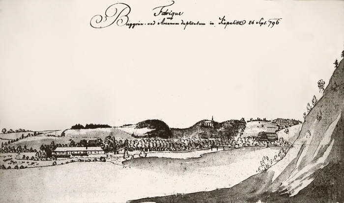 Kapalice, kresba J. Venuta z roku 1796. Pohled přes Strádovku (Chrudimku) na papírnu s vodním pohonem