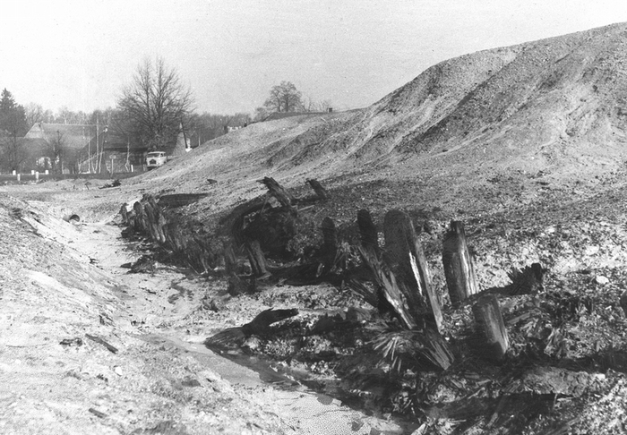 Odkryté zbytky dřevěných sloupů, na tomto místě stály v 1. polovině 19. století kyzové hutě